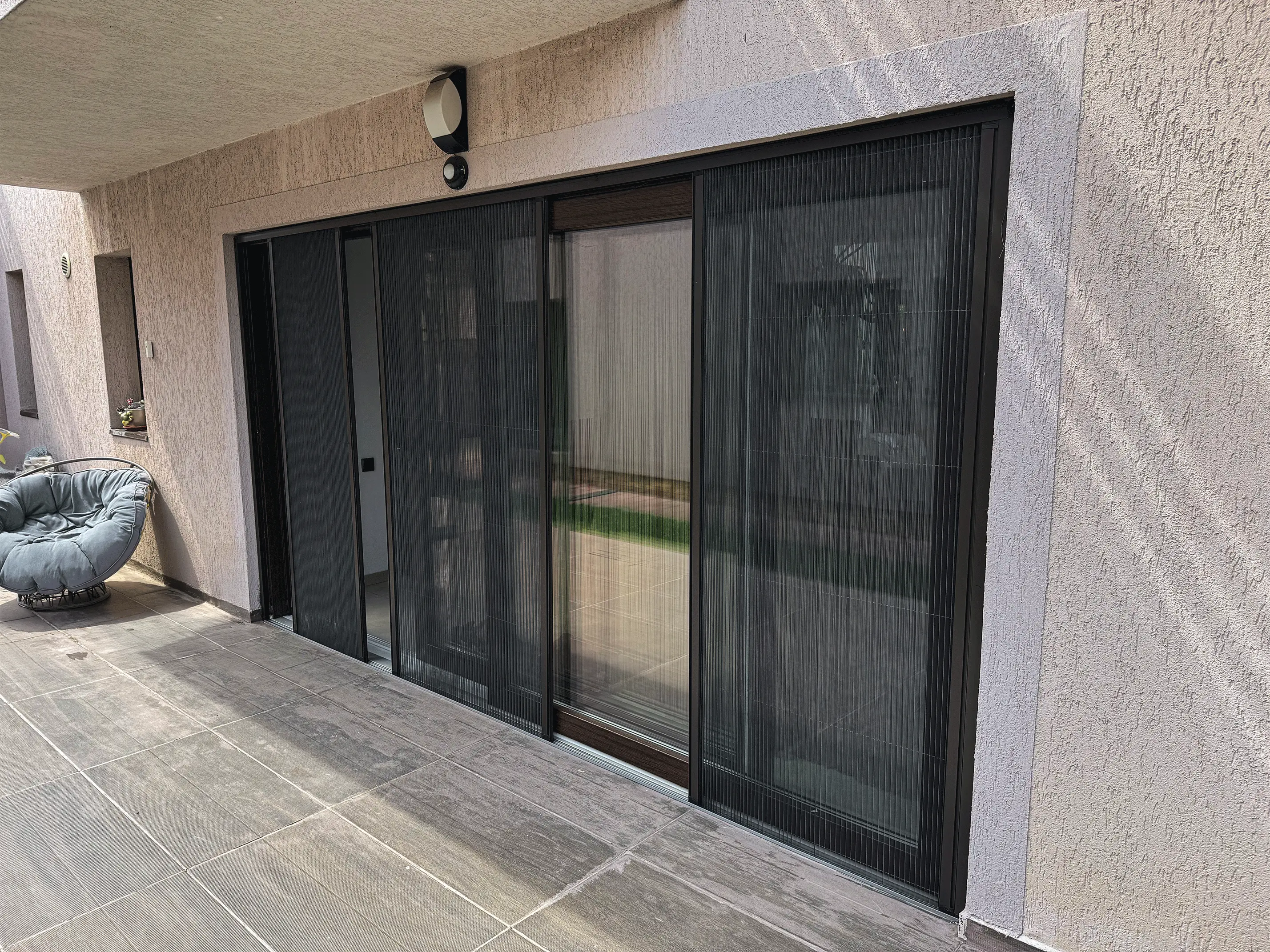 Pentru acest spațiu generos de acces către terasă, am realizat și montat o plasă de insecte tip plisse cu 3 canate mobile, special concepută pentru a asigura atât funcționalitate, cât și estetică. Cu o deschidere totală de 4870 mm lungime și 2050 mm înălțime, proiectul a fost adaptat milimetric pentru a se integra armonios în cadrul existent.